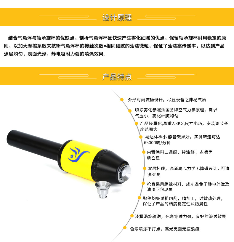 • 特點(diǎn)簡(jiǎn)述:獨(dú)特時(shí)尚外觀專利,避開同志化競(jìng)爭(zhēng),采用美國(guó)進(jìn)口軸承,轉(zhuǎn)速約達(dá)64000轉(zhuǎn)/分鐘,霧化更細(xì)膩、吸附效果倍增??晒?jié)省50%左右的涂料,以減少空氣中的油漆飛沫,從而達(dá)到環(huán)保節(jié)能新標(biāo)準(zhǔn)。產(chǎn)品8年質(zhì)保,1年保修,90天無理由退換。